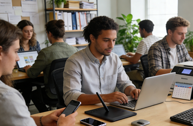 - 真实场景:几十张开放式工位,没有隔断,大家面对面办公,每张工位都摆着不同的数码设备 —— 比如编辑的工位上堆着待测评的手机、相机,技术的工位上连着手提电脑、显示器、测试设备,客服的工位上放着平板(方便随时回复用户咨询);